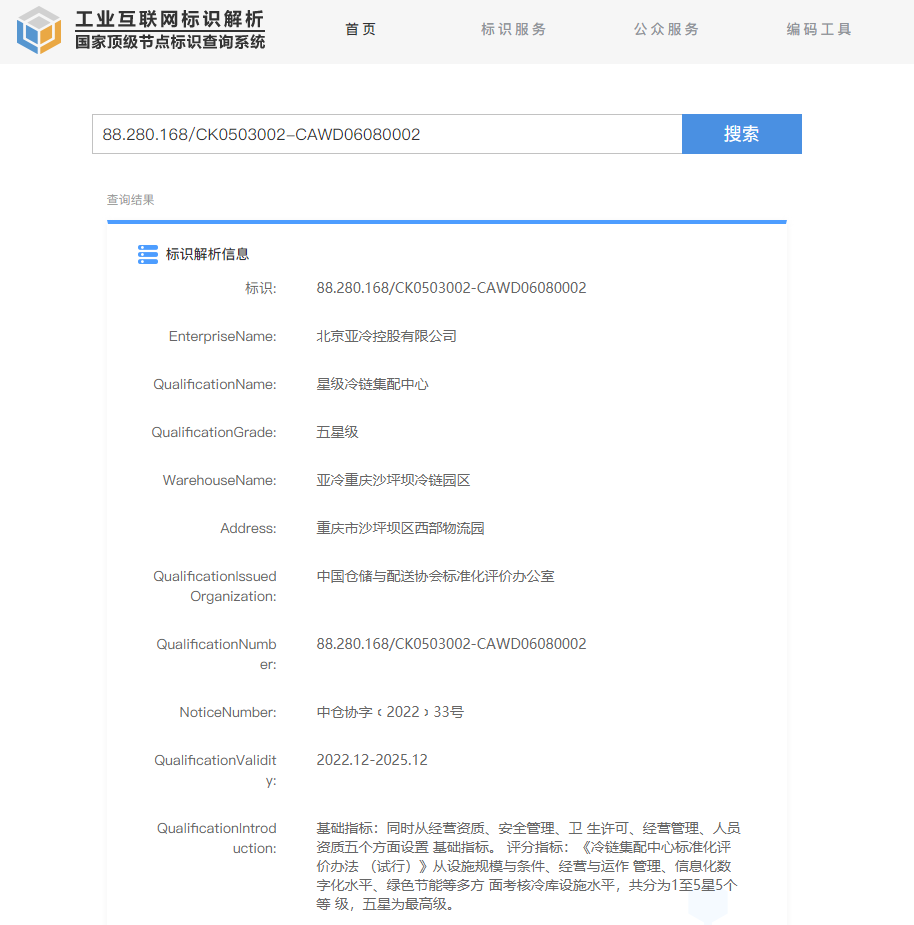 這是行業內首次建立冷鏈集配中心標準化體系,并且開展的第一批等級資質評標項目,亞冷重慶沙坪壩冷鏈園區一舉拿到最高標準“五星級冷鏈集配中心”資質,這代表著該園區在設施規模與條件、經營與運作管理、信息化數字化水平、綠色節能等多方面均達到國內頂尖水平。這得益于亞冷是同行業中體系標準建設起步早、標準較高、執行較好的企業。